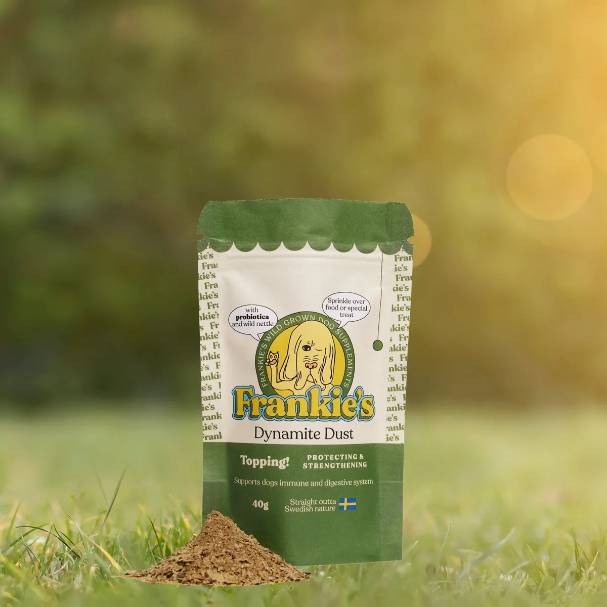 Dynamite Dust är ett kosttillskott som du strör över maten och din vovve får i sig massor av viktiga vitaminer, mineraler, antioxidanter, aminosyror och probiotika baserat på naturliga råvaror. Innehåller mjölksyrebakterier som hjälper hundars tarmflora och stärker matsmältningssystemet. Supernyttigt samtidigt så det fungerar som en riktig aptitretare. Tillverkat i Sverige. Frankie's topping stödjer hälsosam matsmältning och ett starkt immunförsvar. Dynamite Sust stärker och skyddar. Med både probiotika och prebiotika