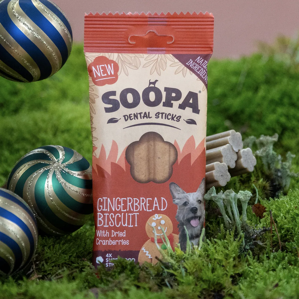 På bilden med fyra fina belöningar ser du framifrån: liten Bim Belly Bom, grisrulle, älgpinne och Bim Belly Bom.