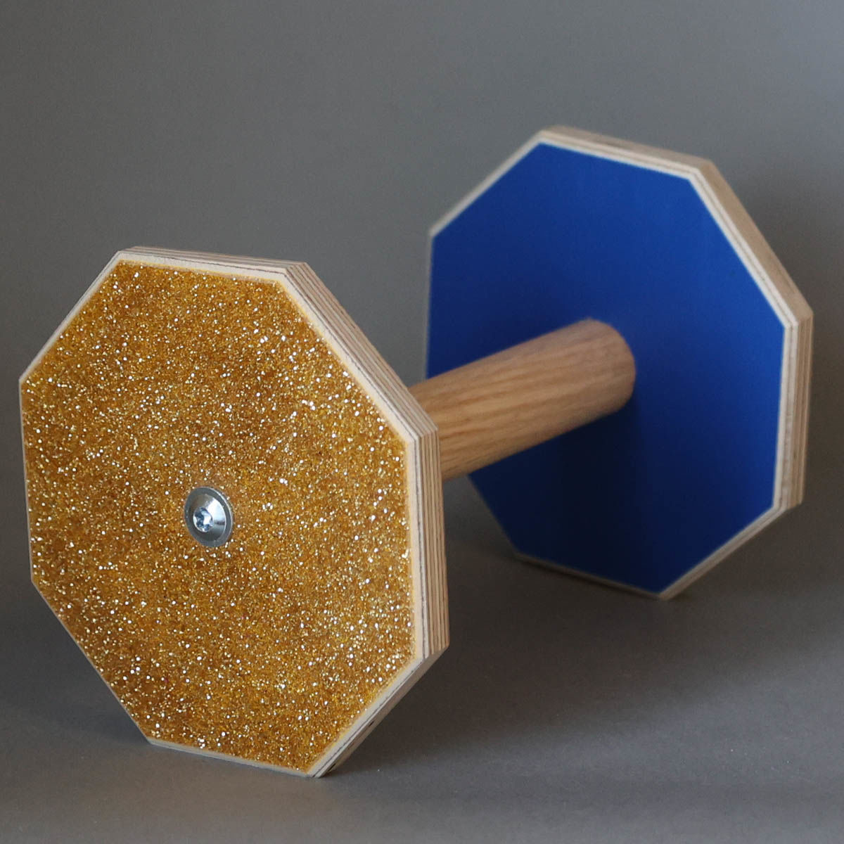 Lydnadsapport utöver det vanliga, som ger festkänsla till träningen. Lydnadsapporten Larz Glitterz har glittereffekt i färgen och en hård glänsande lackyta som gör den superglansig och dessutom extra tålig. Denna har gul, glittrig utsida och enfärgad blå insida. Den är i storlek STOR. Apporterna från Larz Glitterz är ett riktigt fint hantverk och de är tillverkade i Sverige. Lydnadsapporten är mycket stabil och hållbar, tillverkad i bra material. Greppinnen är av hård ek och sidorna är av handmålad björkplywood med naturfärgade kanter. SM nästa? Alla apporter du kan beställa hos oss finns i lager och skickas omgående, så du kan träna direkt nästan.