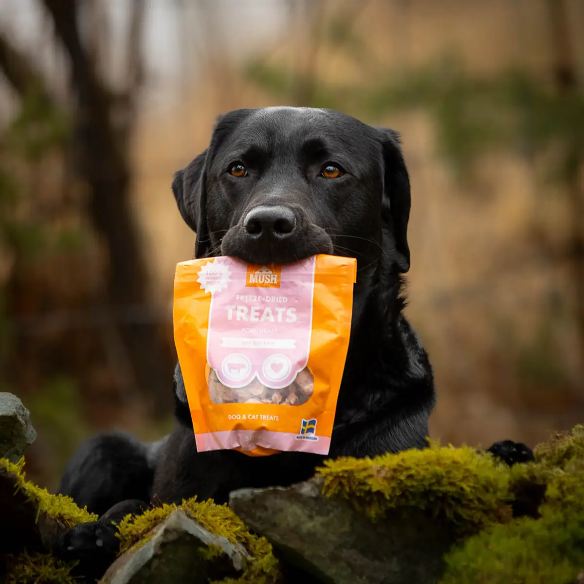 Hundgodis från MUSH. Kyccklinghjärta som frystorkats helt utan tillsatser, det är både gott och innehåller mycket nyttigt. Råvaran är nordisk. Det är smakar riktigt gott för de flesta hundarna, lyxbelöning. Och det innehåller alltså bara kycklinghjärta till 100%. Inget annat är tillsatt. Kycklinghjärta är rikt på näringsämnen och helt perfekt som träningsgodis för att hålla hunden motiverad.