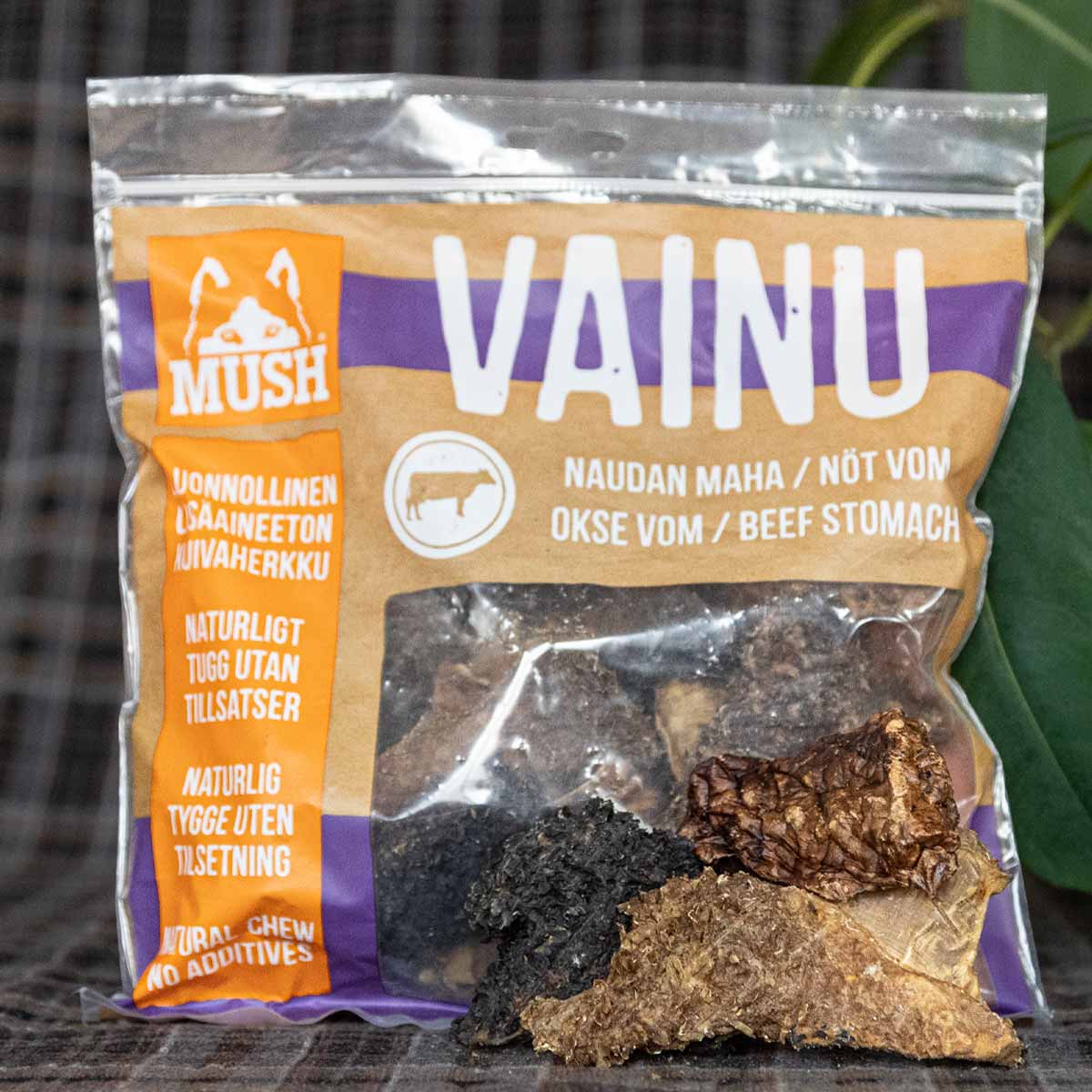 MUSH VAINU® Nötvom är gott för våra fyrbenta vänner. Bitarna passar som belöning men också som tugg till de små hundarna. Det är lite som snack, en belöning som varar en stund. Nötvom passar stora och små hundar och även till katt. Vill du kan du klippa vomen i mindre bitar. Smulad nötvom på maten är en smaskig smakförstärkare om din hund har lite dålig aptit.