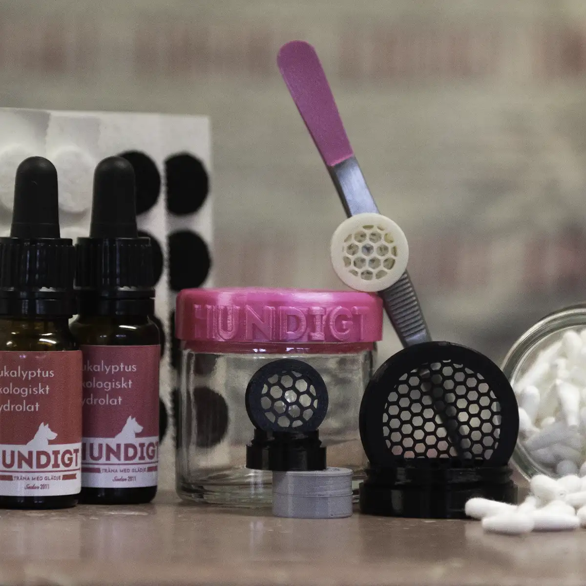 I Hundigts nosework startkit får du det viktigaste för att komma igång med nosework-träningen. Du får ekologisk doft, doftbärare i form av ekologiska tops och möbeltassar, dofthållare HONEY med magnet och en smellerburk honeycomb-mönster i locket.
