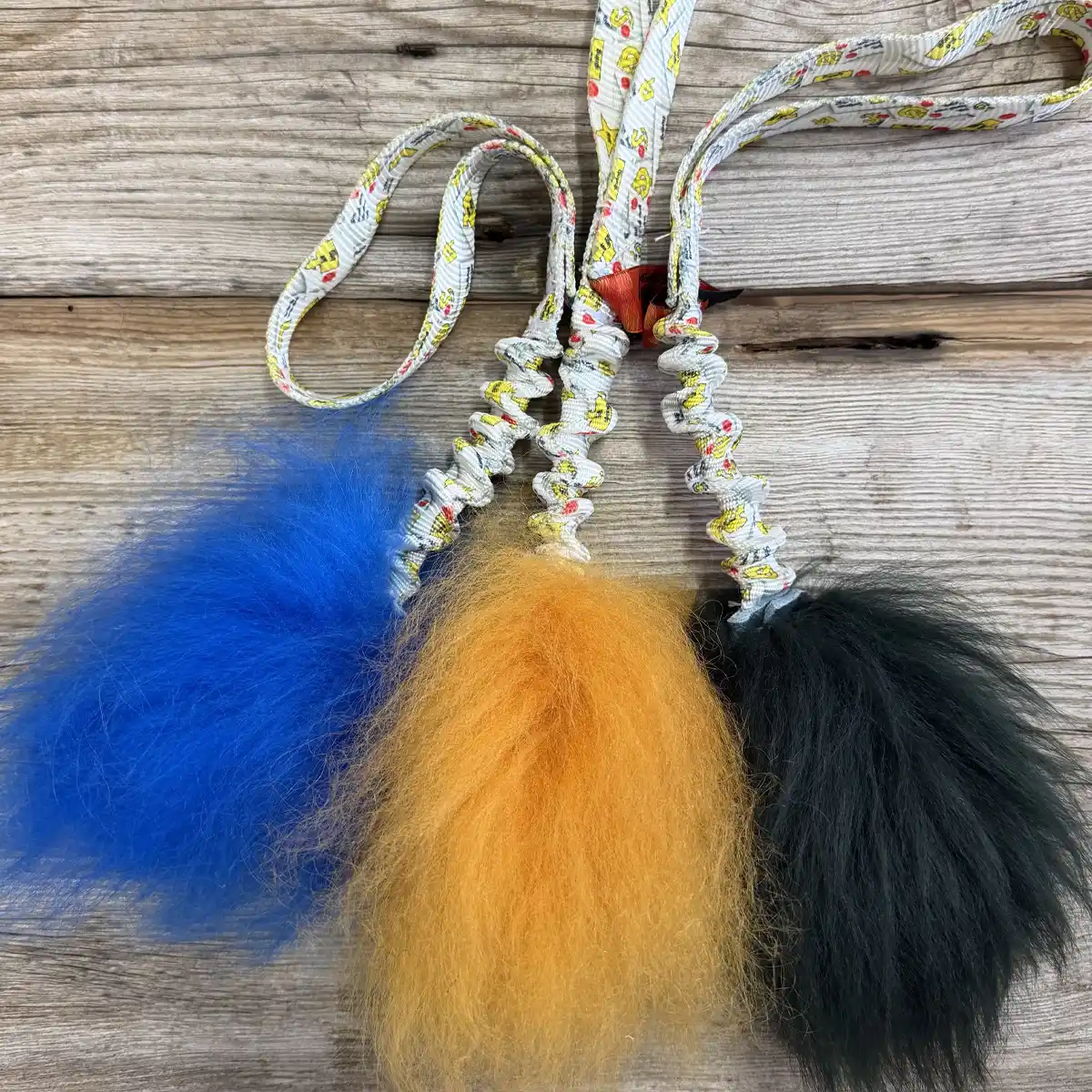 En kul hundleksak som triggar igång jaktlust, bus och fart. Remmen är av dubbel, mjuk velour med knut i ena änden och en tofs av svenskt fårskinn i den andra. Vi tycker den är både fin för oss och rolig för hundarna. Den passar riktigt bra till valpar.