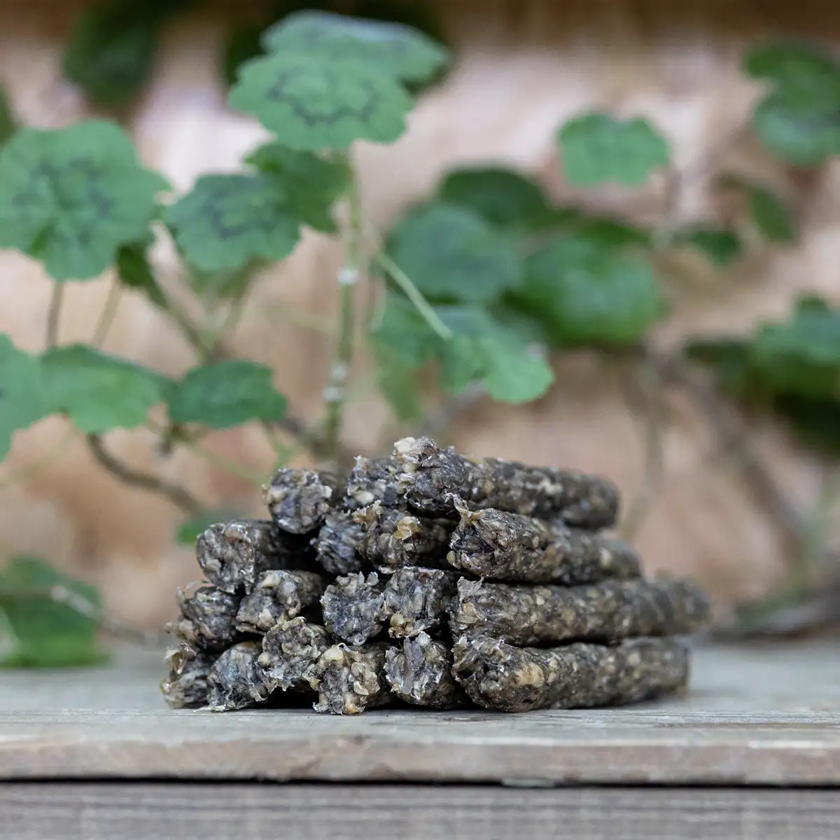 Crunchy Nöt 13 är en knaprig och god tuggpinne från RAUH. Nöthuden som är i Crunchy Nöt har krossats, så det är mjukare än ett vanligt tuggben och passar alla hundar, liten som stor. Det passar också fint till hundar med känslig mun, seniorer och valpar. Till nötskinn tillsätts nötvom, havstång och persilja för att förhöja smaken. Stora hundar tuggar i sig Crunchy Nöt 13 snabbt och tuggpinnen fungerar också bra som fin belöning efter arbete. Spill från produktionen har tagits tillvara, krossats och pressats tillsammans med morot, havstång och persilja. Det blir ett smakligt tugg.