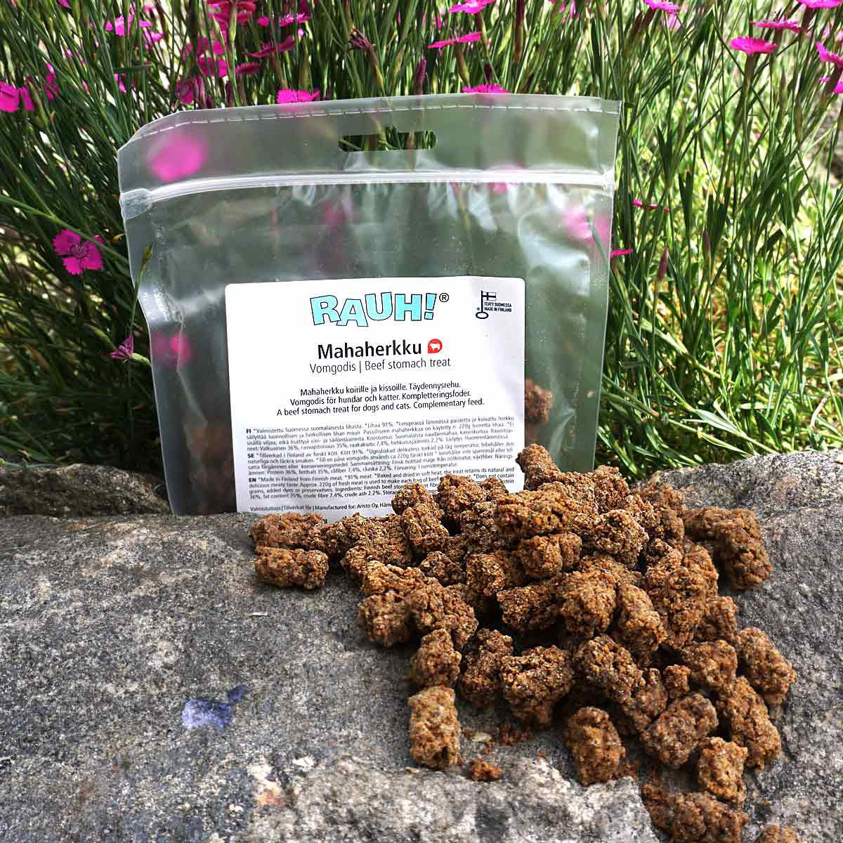 RAUH har all tillverkning i Finland och råvaran är finsk och noga utvald. Nötlevern bakas långsamt i ugn på låg temperatur så den naturliga smaken bibehålls. Ett gott och nyttigt belöningsgodis på promenaden likväl som till träningen. RAUH. Köttinnehållet är 93%.